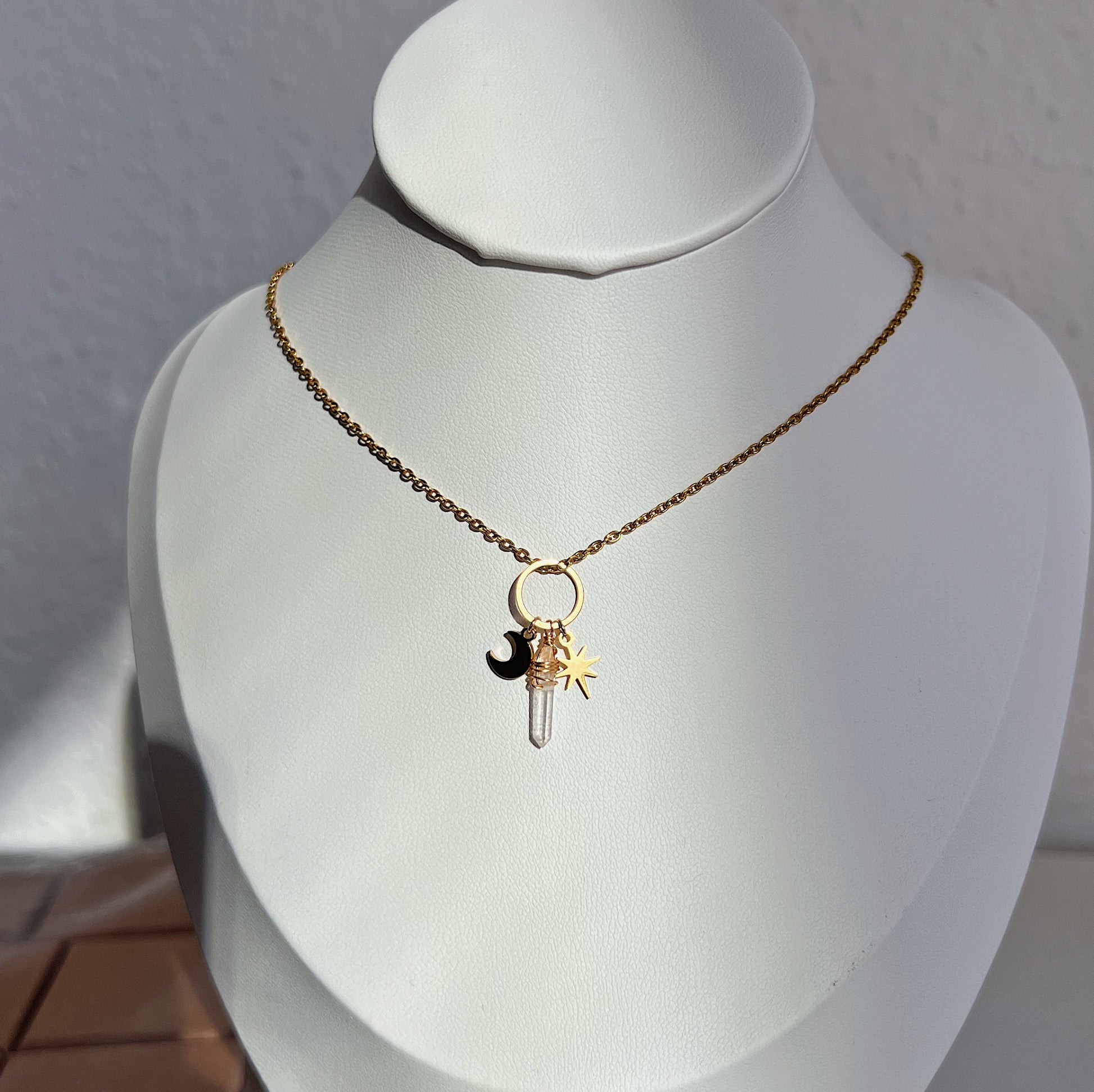 Dieser Kettenanhänger vereint himmlische und erdverbundene Elemente in einem einzigartigen Design: Ein filigraner Stern, ein sanft schimmernder Mond und ein klarer Bergkristall schmücken den zeitlosen Kettenanhänger. Der Stern steht für Hoffnung, der Mond für Intuition und der Bergkristall für Klarheit ein Schmuckstück, das die Magie des Universums einfängt und dich strahlen lässt.
